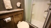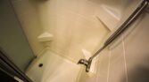 Spacious bathroom with glass-enclosed shower (tall-friendly design)